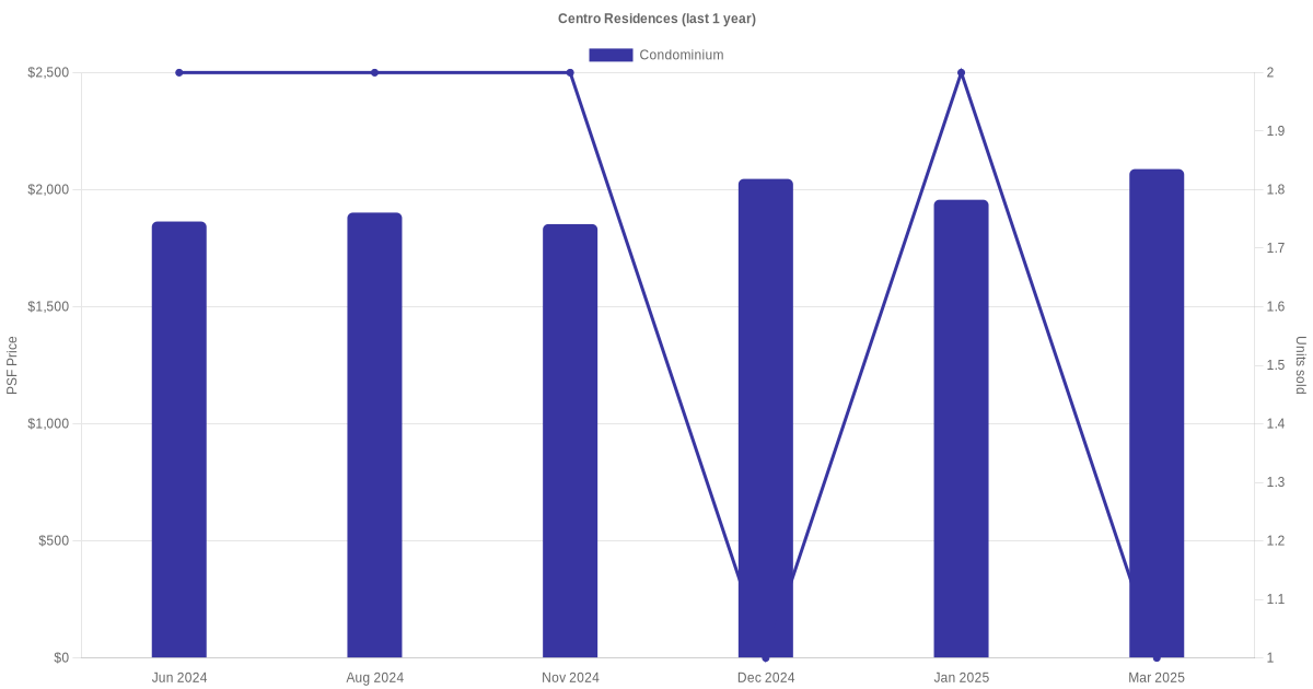 Compare sales, rental and their respective PSF price trends of Centro Residences and other nearby private property projects within 2km.