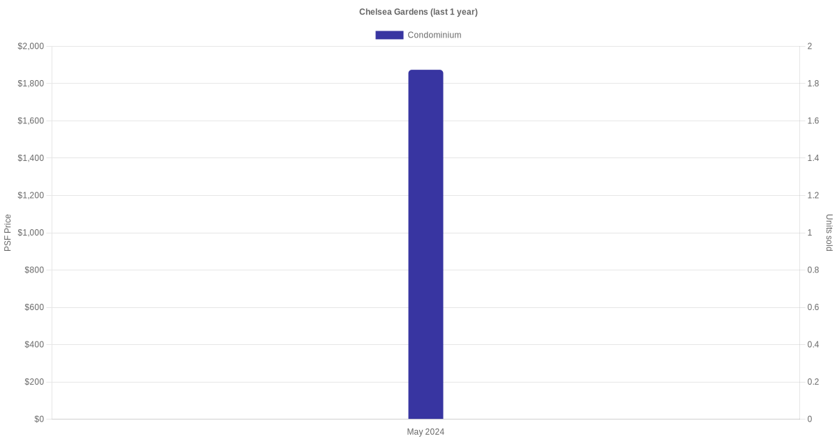 There were a total of 2 sales transactions for Chelsea Gardens in the last 3 years, with the latest one recorded in May 2024. Disclaimer : our transactions data below does not include block numbers as the data is not available.