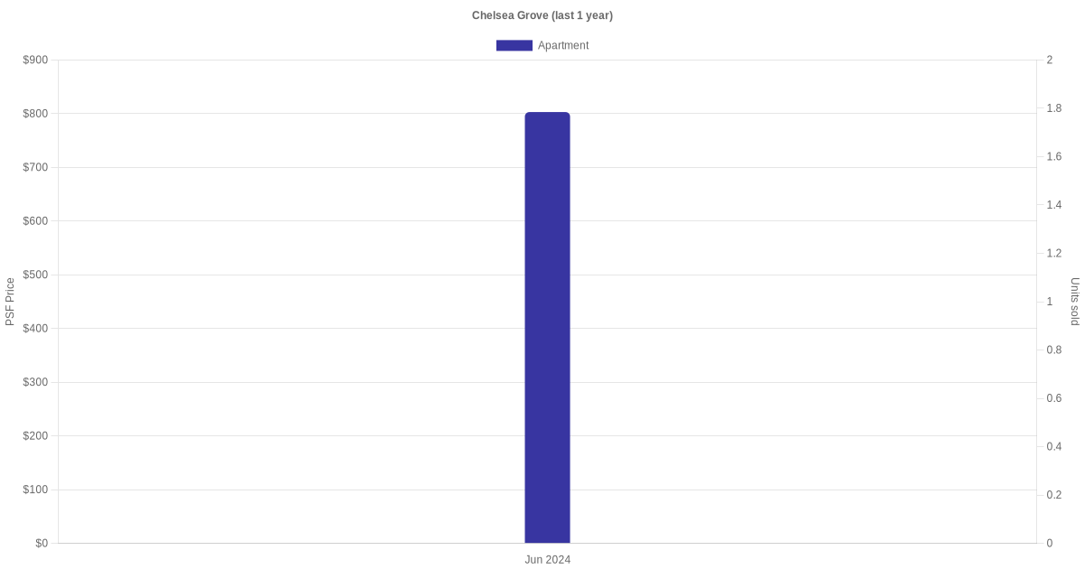 The graph below shows the average monthly transacted sale price for each of the apartment units for Chelsea Grove in the last 3 years. This is based on the transactional data collated for Chelsea Grove for the selected period.