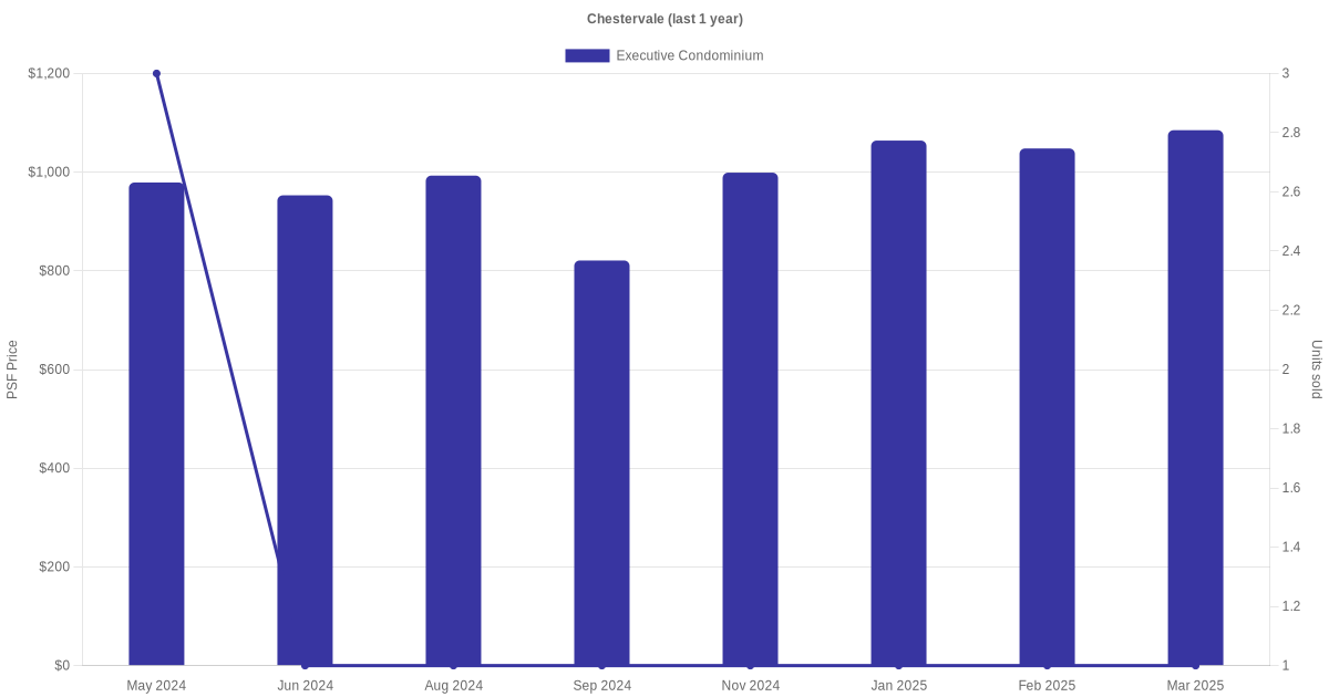 The graph below shows the average monthly transacted sale price for each of the executive condominium units for Chestervale in the last 3 years. This is based on the transactional data collated for Chestervale for the selected period.