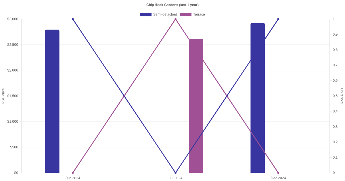 There were a total of 5 sales transactions for Chip Hock Gardens in the last 3 years, with the latest one recorded in Dec 2024. Disclaimer : our transactions data below does not include block numbers as the data is not available.