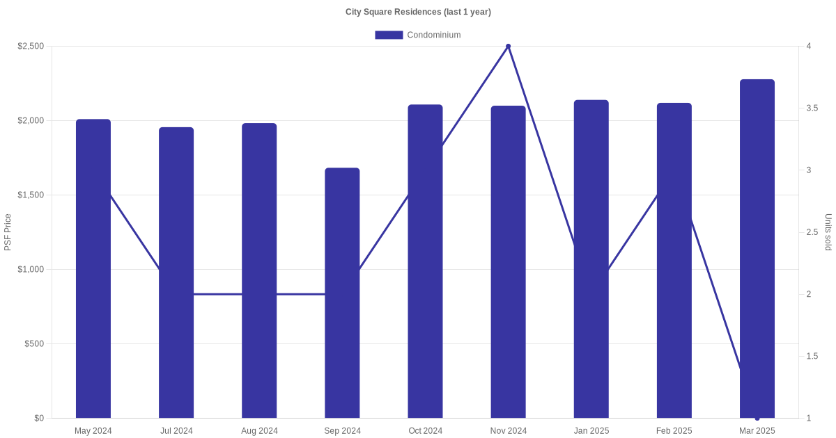 There were a total of 52 sales transactions for City Square Residences in the last 3 years, with the latest one recorded in Dec 2025. Disclaimer : our transactions data below does not include block numbers as the data is not available. If you would like to see a list of blocks / addresses associated with City Square Residences, please click here.