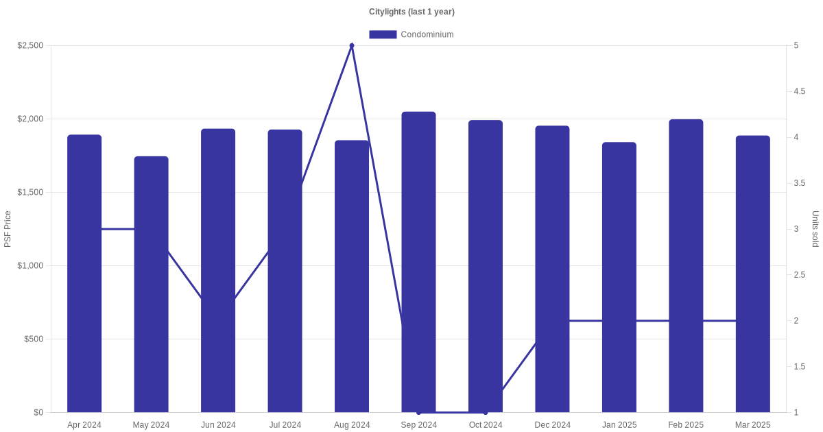 There were a total of 66 sales transactions for Citylights in the last 3 years, with the latest one recorded in Jan 2026. Disclaimer : our transactions data below does not include block numbers as the data is not available. If you would like to see a list of blocks / addresses associated with Citylights, please click here.