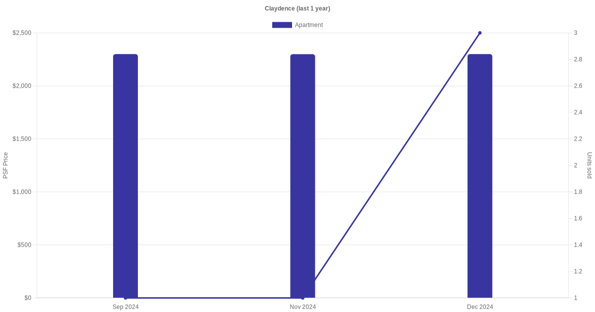 The graph below shows the average monthly transacted sale price for each of the apartment units for Claydence in the last 3 years. This is based on the transactional data collated for Claydence for the selected period.