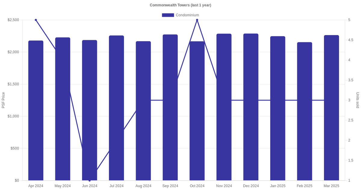 | Oct 2025 | $1,575,000 (Resale) | $2,286 | Condominium | Commonwealth Towers Commonwealth Avenue (District 03) | 11-15 | 689 sqft | 99 years | 2013 |