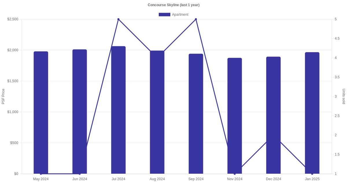 The graph below shows the average monthly transacted sale price for each of the apartment units for Concourse Skyline in the last 3 years. This is based on the transactional data collated for Concourse Skyline for the selected period.