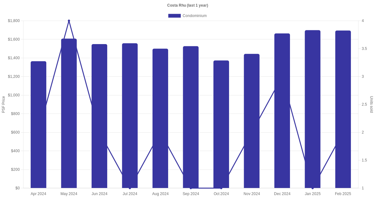 There were a total of 63 sales transactions for Costa Rhu in the last 3 years, with the latest one recorded in Dec 2025. Disclaimer : our transactions data below does not include block numbers as the data is not available. If you would like to see a list of blocks / addresses associated with Costa Rhu, please click here.