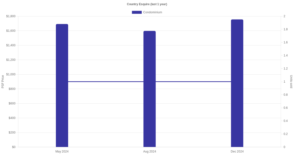 There were a total of 3 sales transactions for Country Esquire in the last 3 years, with the latest one recorded in Dec 2024. Disclaimer : our transactions data below does not include block numbers as the data is not available.