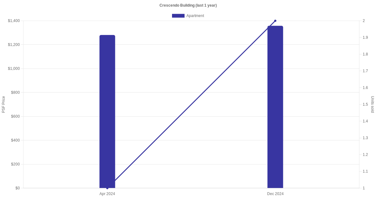There were a total of 5 sales transactions for Crescendo Building in the last 3 years, with the latest one recorded in Dec 2024. Disclaimer : our transactions data below does not include block numbers as the data is not available.