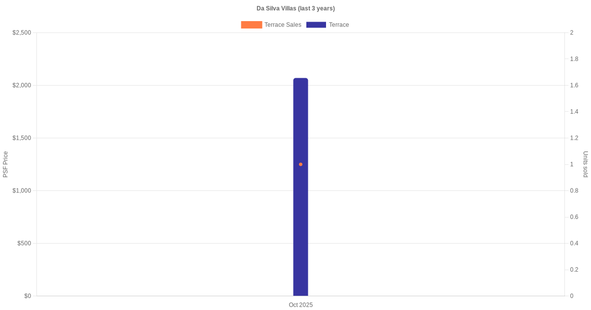 There were a total of 1 sales transactions for Da Silva Villas in the last 3 years, with the latest one recorded in Oct 2025. Disclaimer : our transactions data below does not include block numbers as the data is not available. If you would like to see a list of blocks / addresses associated with Da Silva Villas, please click here.