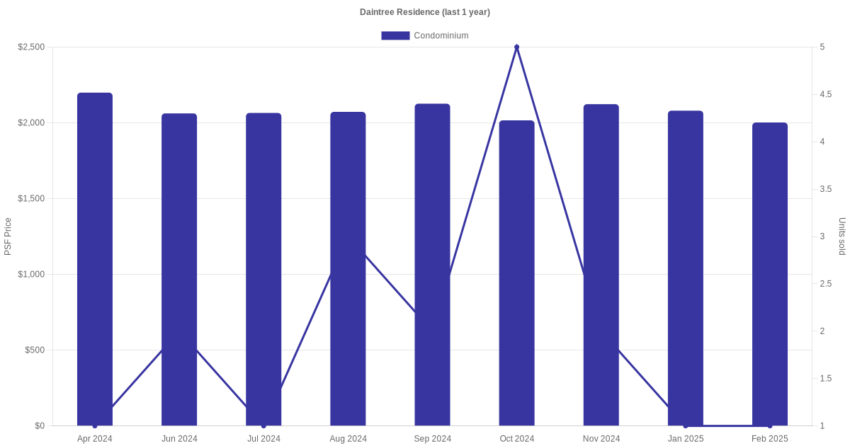There were a total of 61 sales transactions for Daintree Residence in the last 3 years, with the latest one recorded in Dec 2025. Disclaimer : our transactions data below does not include block numbers as the data is not available.