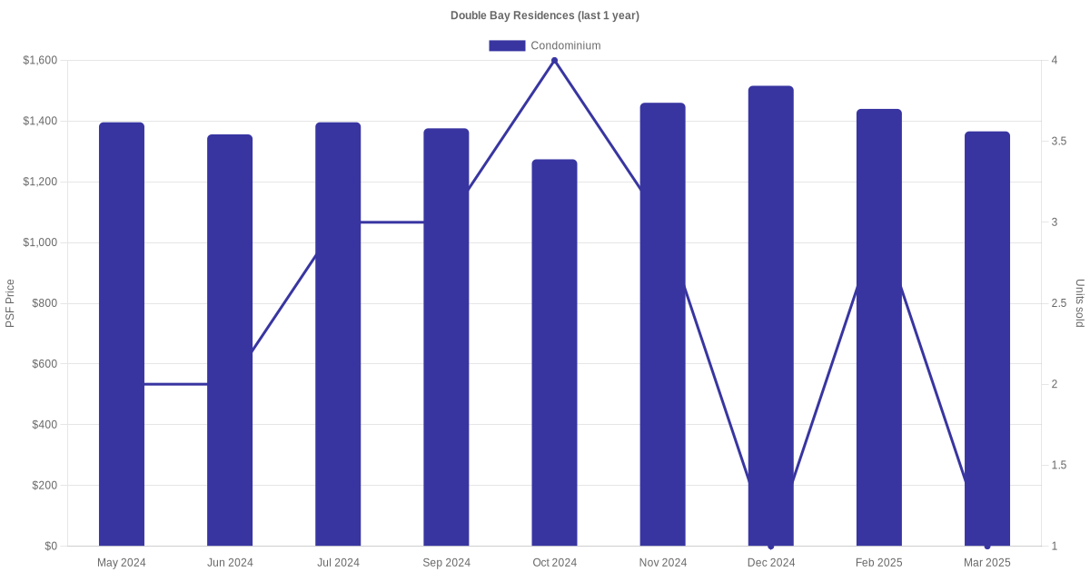 There were a total of 69 sales transactions for Double Bay Residences in the last 3 years, with the latest one recorded in Dec 2025. Disclaimer : our transactions data below does not include block numbers as the data is not available. If you would like to see a list of blocks / addresses associated with Double Bay Residences, please click here.
