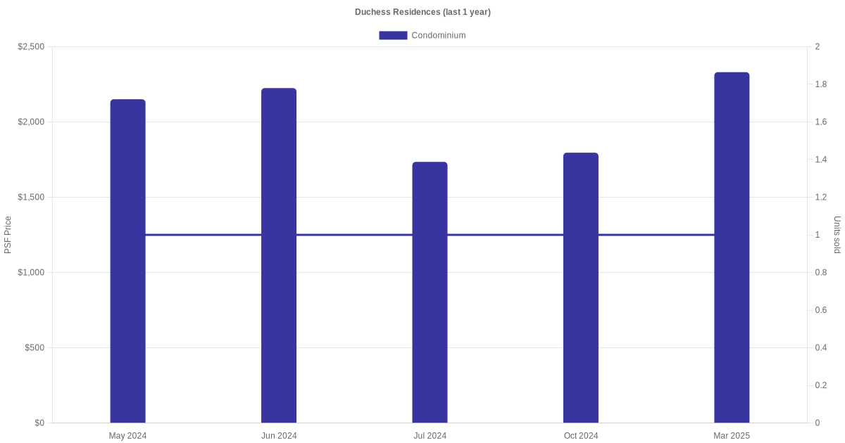 There were a total of 9 sales transactions for Duchess Residences in the last 3 years, with the latest one recorded in Mar 2025. Disclaimer : our transactions data below does not include block numbers as the data is not available.