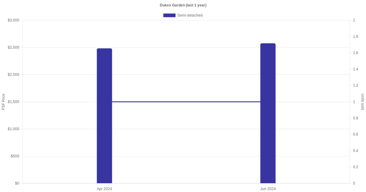 The graph below shows the average monthly transacted sale price for each of the semi-detached units for Duke's Garden in the last 3 years. This is based on the transactional data collated for Duke's Garden for the selected period.