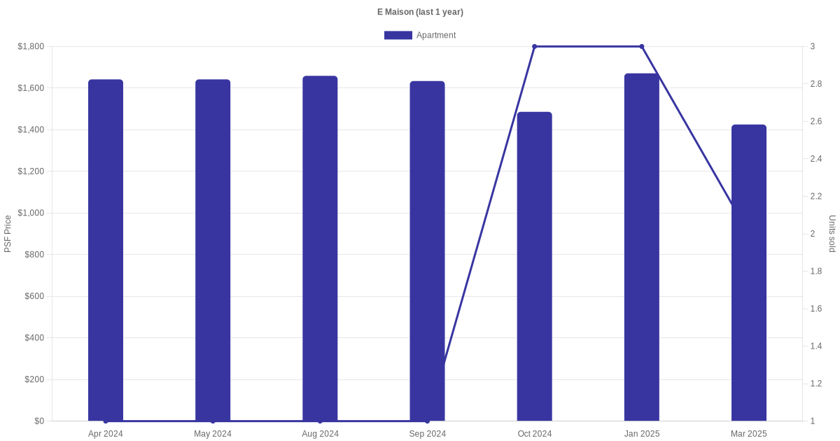 There were a total of 27 sales transactions for E Maison in the last 3 years, with the latest one recorded in Oct 2025. Disclaimer : our transactions data below does not include block numbers as the data is not available.