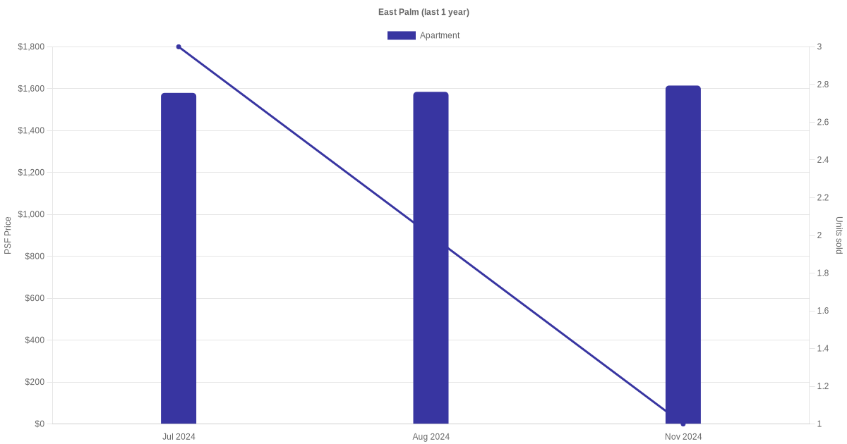 There were a total of 17 sales transactions for East Palm in the last 3 years, with the latest one recorded in Sep 2025. Disclaimer : our transactions data below does not include block numbers as the data is not available.