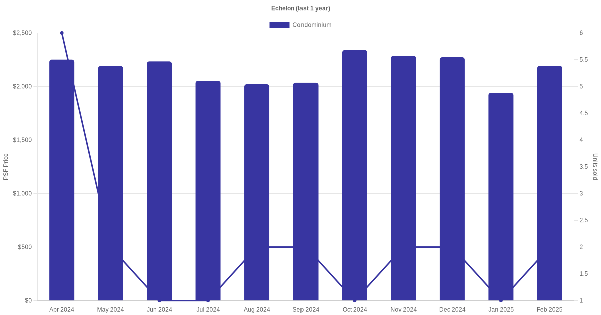 The graph below shows the average monthly transacted sale price for each of the condominium units for Echelon in the last 3 years. This is based on the transactional data collated for Echelon for the selected period.