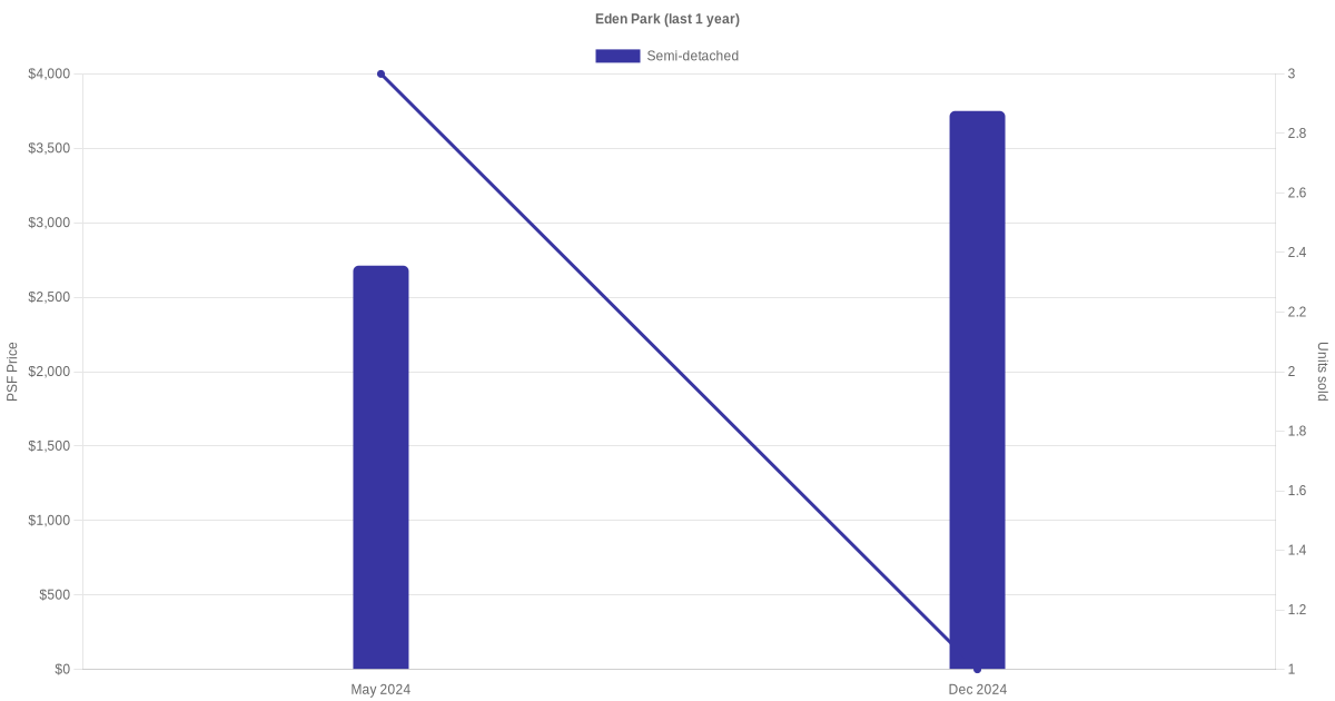 There were a total of 13 sales transactions for Eden Park in the last 3 years, with the latest one recorded in Dec 2025. Disclaimer : our transactions data below does not include block numbers as the data is not available.