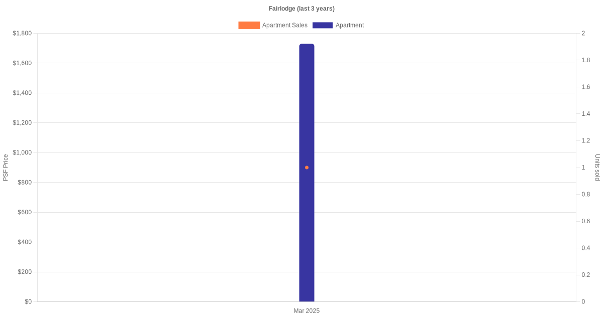 There were a total of 1 sales transactions for Fairlodge in the last 3 years, with the latest one recorded in Mar 2025. Disclaimer : our transactions data below does not include block numbers as the data is not available. If you would like to see a list of blocks / addresses associated with Fairlodge, please click here.