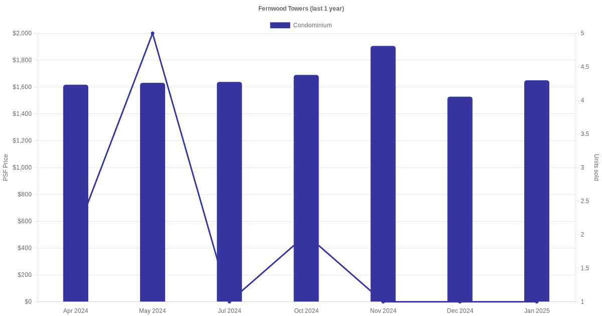The graph below shows the average monthly transacted sale price for each of the condominium units for Fernwood Towers in the last 3 years. This is based on the transactional data collated for Fernwood Towers for the selected period.
