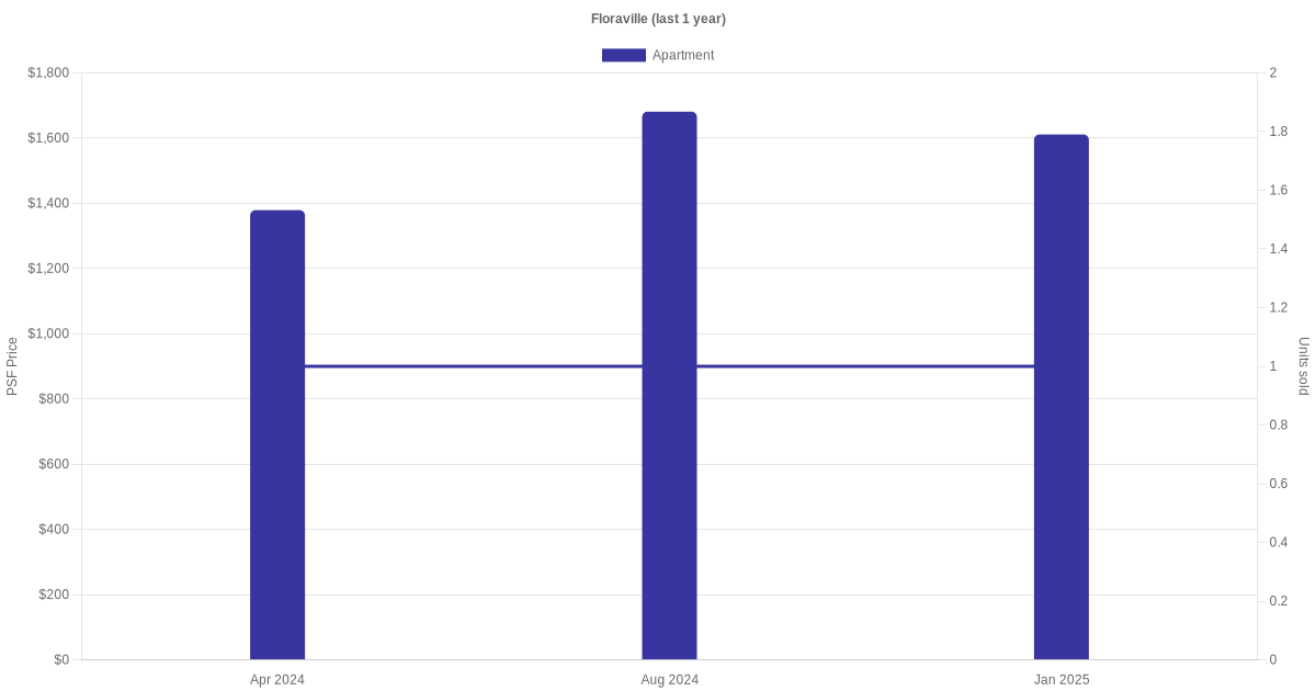 The graph below shows the average monthly transacted sale price for each of the apartment units for Floraville in the last 3 years. This is based on the transactional data collated for Floraville for the selected period.