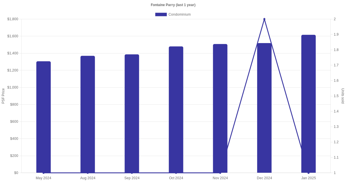 The graph below shows the average monthly transacted sale price for each of the condominium units for Fontaine Parry in the last 3 years. This is based on the transactional data collated for Fontaine Parry for the selected period.