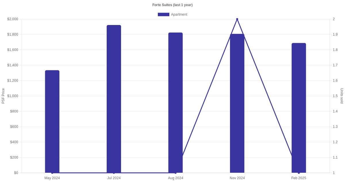 There were a total of 14 sales transactions for Forte Suites in the last 3 years, with the latest one recorded in Dec 2025. Disclaimer : our transactions data below does not include block numbers as the data is not available.