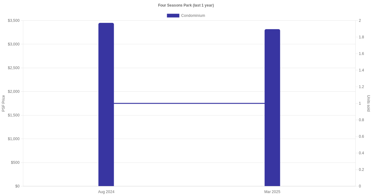 There were a total of 9 sales transactions for Four Seasons Park in the last 3 years, with the latest one recorded in Oct 2025. Disclaimer : our transactions data below does not include block numbers as the data is not available.