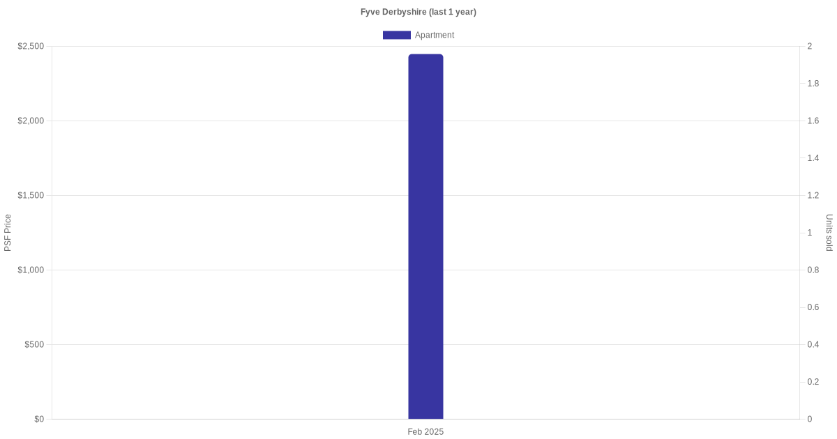 The graph below shows the average monthly transacted sale price for each of the apartment units for Fyve Derbyshire in the last 3 years. This is based on the transactional data collated for Fyve Derbyshire for the selected period.