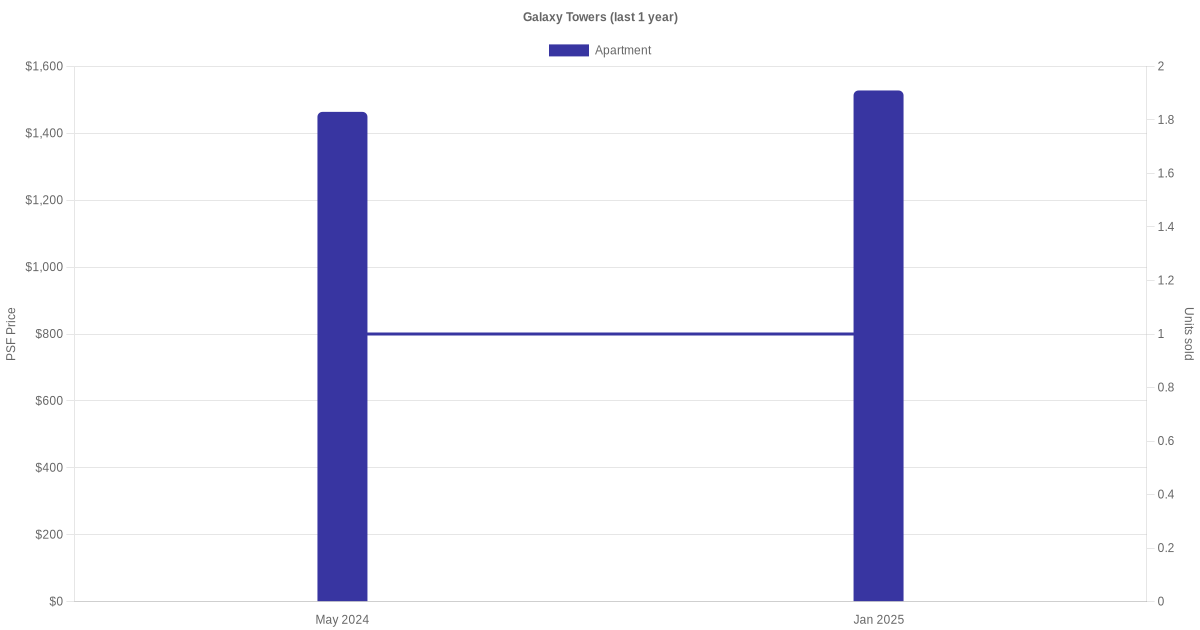There were a total of 7 sales transactions for Galaxy Towers in the last 3 years, with the latest one recorded in Sep 2025. Disclaimer : our transactions data below does not include block numbers as the data is not available.