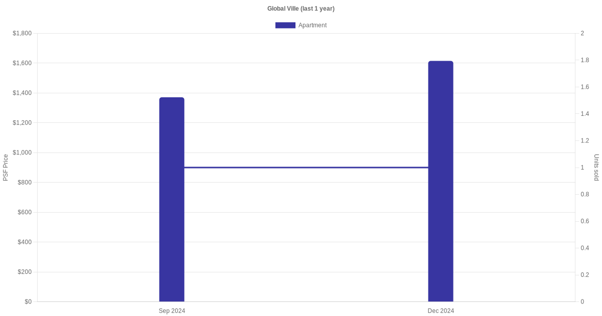 The graph below shows the average monthly transacted sale price for each of the apartment units for Global Ville in the last 3 years. This is based on the transactional data collated for Global Ville for the selected period.