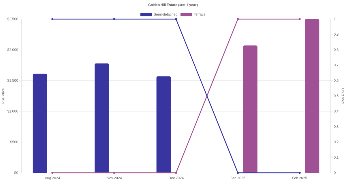 The graph below shows the average monthly transacted sale price for each of the semi-detached and terrace units for Golden Hill Estate in the last 3 years. This is based on the transactional data collated for Golden Hill Estate for the selected period.