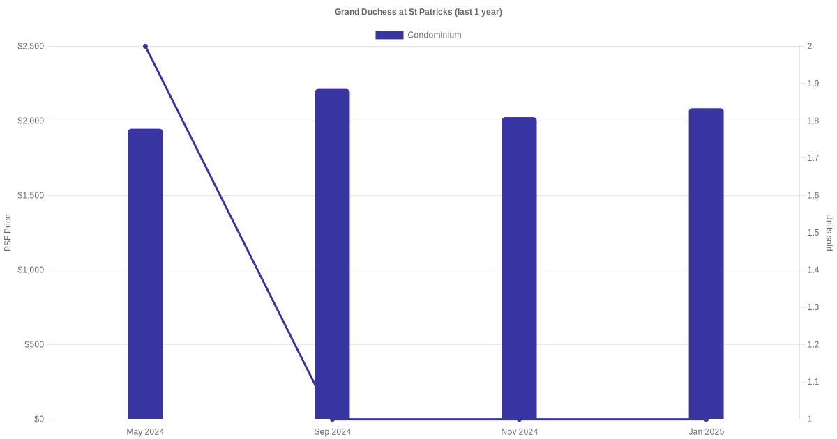 There were a total of 10 sales transactions for Grand Duchess at St Patrick's in the last 3 years, with the latest one recorded in Aug 2025. Disclaimer : our transactions data below does not include block numbers as the data is not available.