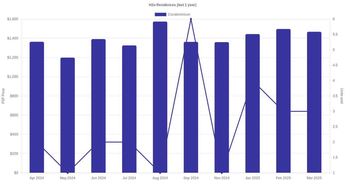 There were a total of 71 sales transactions for H2o Residences in the last 3 years, with the latest one recorded in Dec 2025. Disclaimer : our transactions data below does not include block numbers as the data is not available.