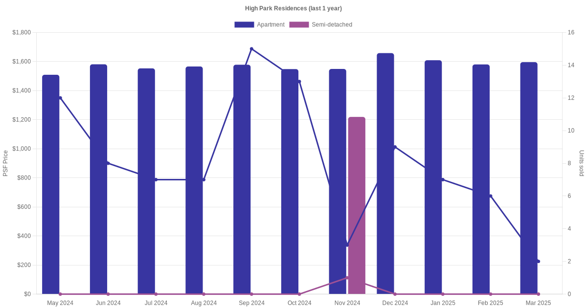The graph below shows the average monthly transacted sale price for each of the apartment and semi-detached units for High Park Residences in the last 3 years. This is based on the transactional data collated for High Park Residences for the selected period.