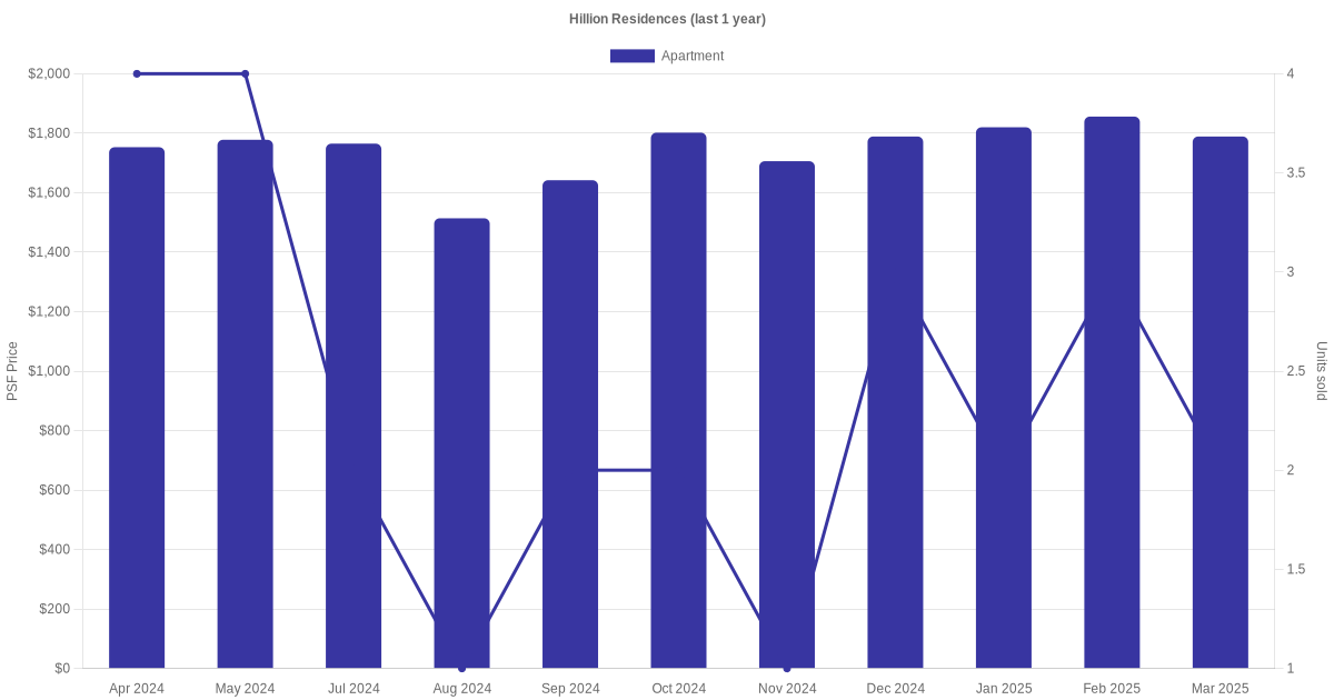 The graph below shows the average monthly transacted sale price for each of the apartment units for Hillion Residences in the last 3 years. This is based on the transactional data collated for Hillion Residences for the selected period.