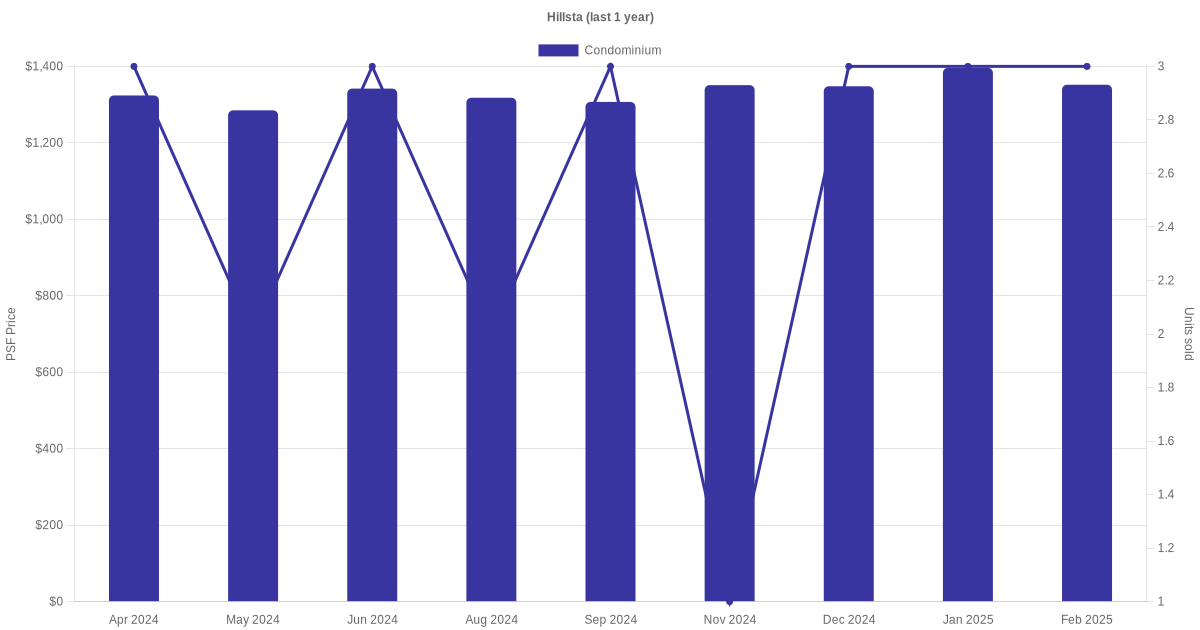 There were a total of 57 sales transactions for Hillsta in the last 3 years, with the latest one recorded in Oct 2025. Disclaimer : our transactions data below does not include block numbers as the data is not available.