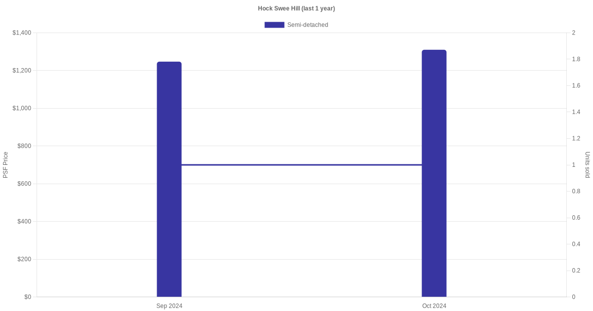 The graph below shows the average monthly transacted sale price for each of the semi-detached units for Hock Swee Hill in the last 3 years. This is based on the transactional data collated for Hock Swee Hill for the selected period.