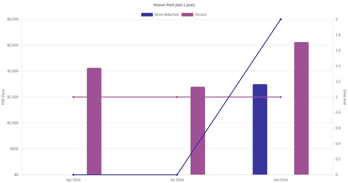 There were a total of 10 sales transactions for Hoover Park in the last 3 years, with the latest one recorded in Aug 2025. Disclaimer : our transactions data below does not include block numbers as the data is not available.