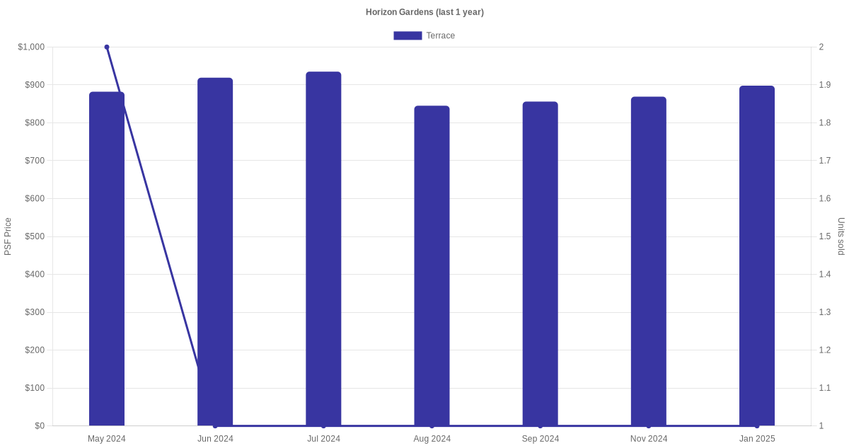 There were a total of 20 sales transactions for Horizon Gardens in the last 3 years, with the latest one recorded in Oct 2025. Disclaimer : our transactions data below does not include block numbers as the data is not available.