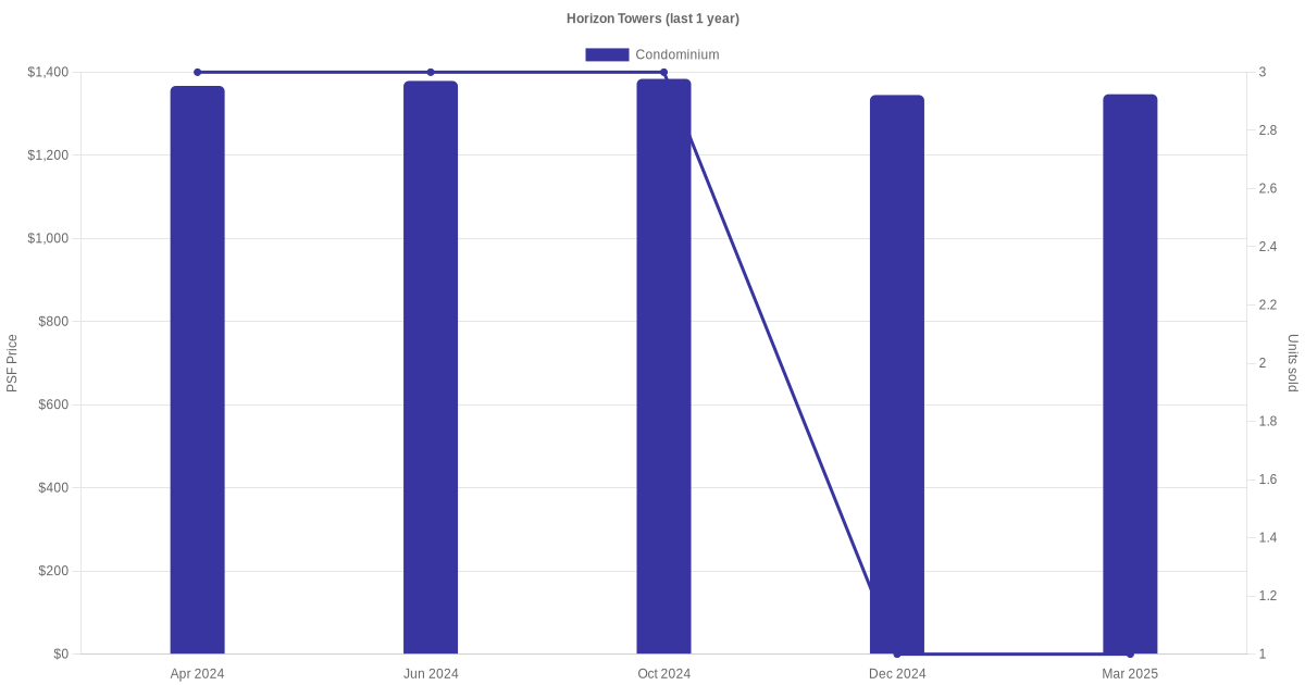 There were a total of 30 sales transactions for Horizon Towers in the last 3 years, with the latest one recorded in Nov 2025. Disclaimer : our transactions data below does not include block numbers as the data is not available.