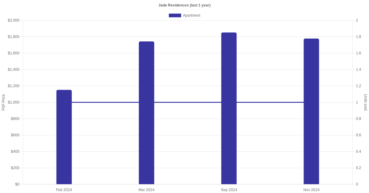 There were a total of 24 sales transactions for Jade Residences in the last 3 years, with the latest one recorded in Oct 2025. Disclaimer : our transactions data below does not include block numbers as the data is not available.