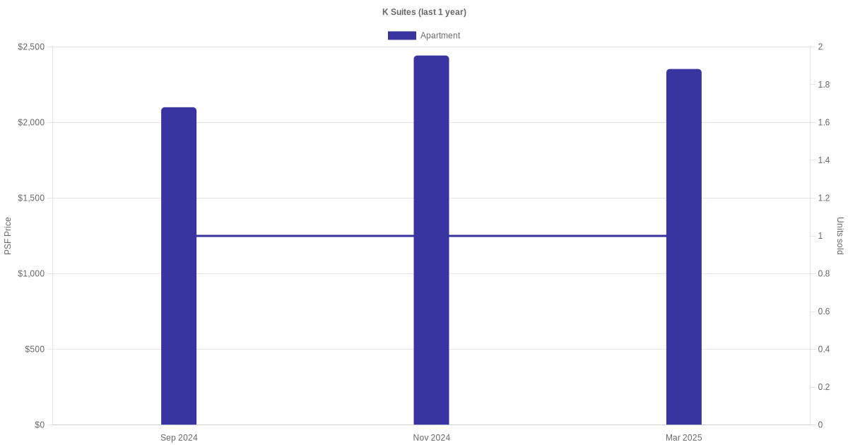 There were a total of 12 sales transactions for K Suites in the last 3 years, with the latest one recorded in Dec 2025. Disclaimer : our transactions data below does not include block numbers as the data is not available.