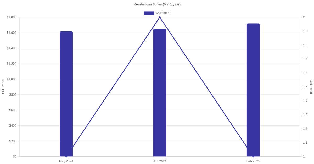 There were a total of 6 sales transactions for Kembangan Suites in the last 3 years, with the latest one recorded in Sep 2025. Disclaimer : our transactions data below does not include block numbers as the data is not available.