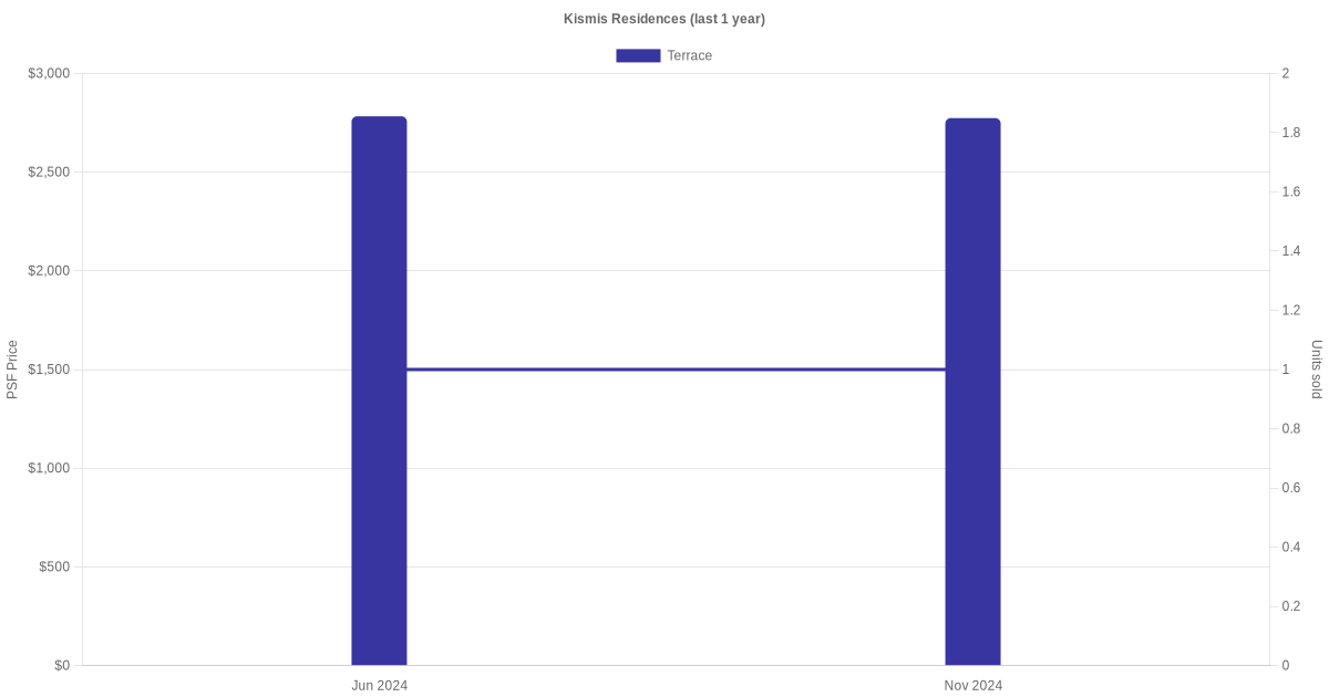 There were a total of 4 sales transactions for Kismis Residences in the last 3 years, with the latest one recorded in Nov 2024. Disclaimer : our transactions data below does not include block numbers as the data is not available.