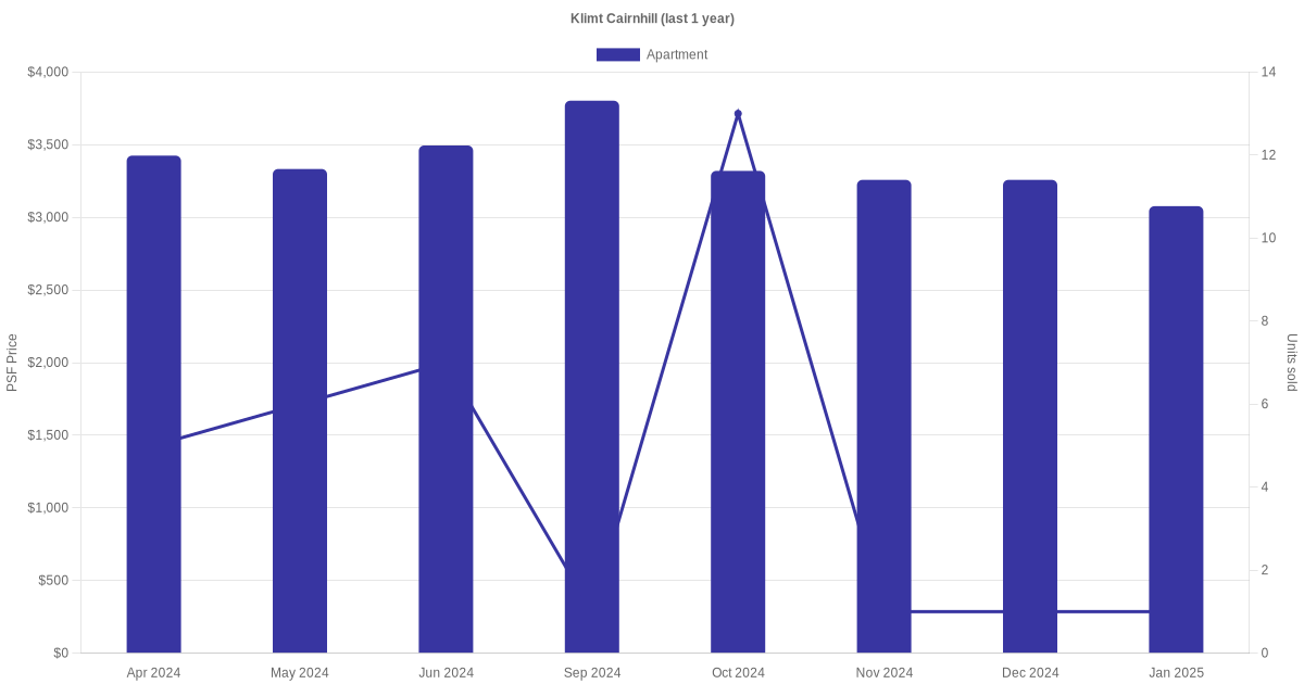 | Jan 2025 | $2,550,000 (New Sale) | $3,077 | Apartment | Klimt Cairnhill Cairnhill Road (District 09) | 21-25 | 829 sqft | Freehold | - |
