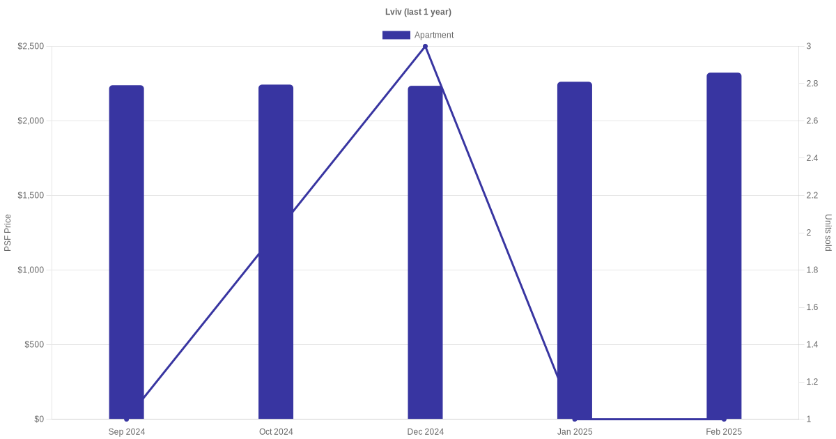 There were a total of 20 sales transactions for L'viv in the last 3 years, with the latest one recorded in Sep 2025. Disclaimer : our transactions data below does not include block numbers as the data is not available.