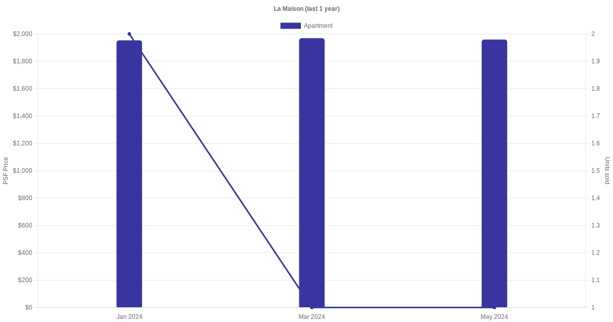 There were a total of 6 sales transactions for La Maison in the last 3 years, with the latest one recorded in Jun 2025. Disclaimer : our transactions data below does not include block numbers as the data is not available.