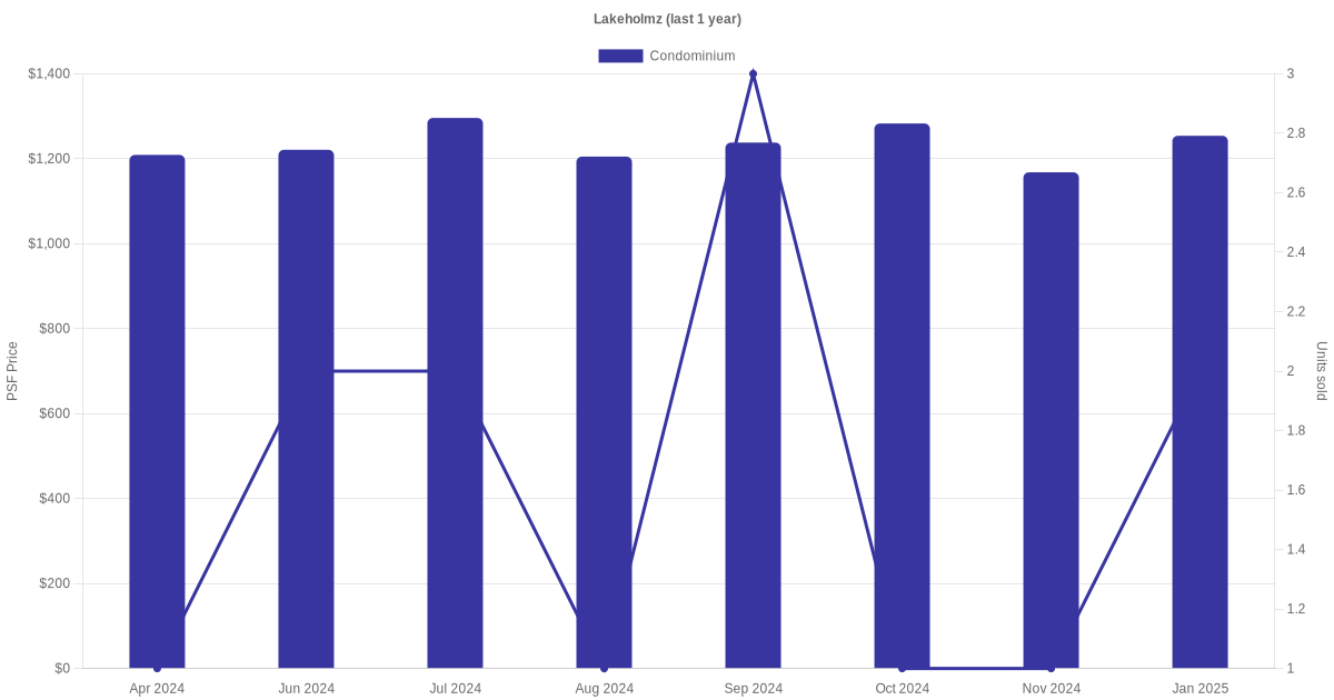 The graph below shows the average monthly transacted sale price for each of the condominium units for Lakeholmz in the last 3 years. This is based on the transactional data collated for Lakeholmz for the selected period.