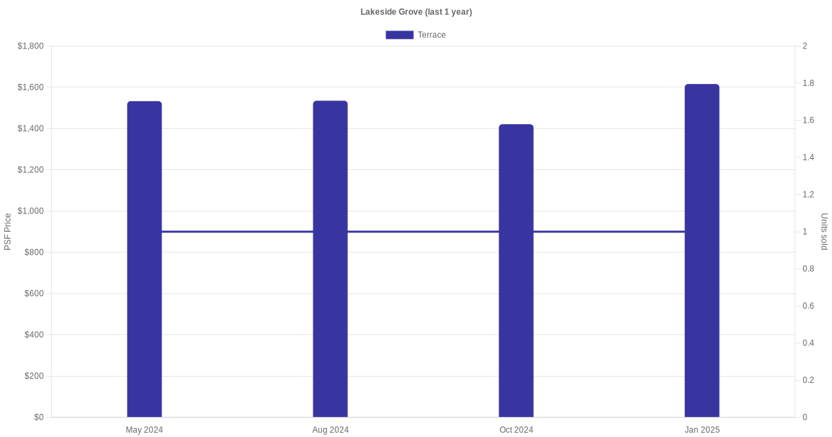 The graph below shows the average monthly transacted sale price for each of the terrace units for Lakeside Grove in the last 3 years. This is based on the transactional data collated for Lakeside Grove for the selected period.